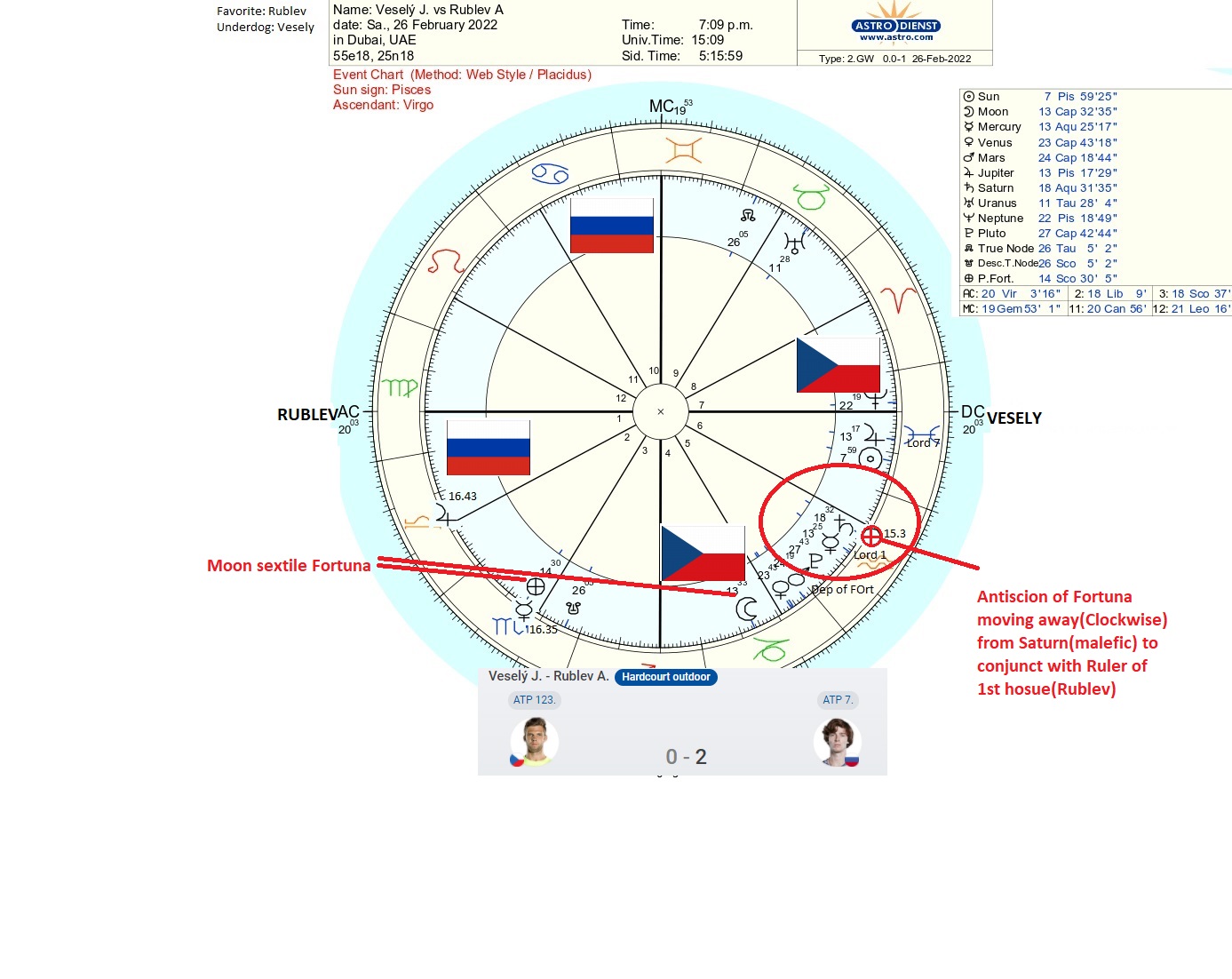 Russian tennis star Rublev won his 10th title with the help of an interesting movement in the heavens above Dubai. There were two significant aspects at the start of the match. The first was Moon’s sextile to Fortuna being a major testimony for favored Rublev. The second aspect was Saturn conjunct with the antiscion(shadow) of Fortuna. Since anticias move in the opposite direction(clockwise) of their bodily counterparts, the antiscion of Fortuna(at 15.3 degrees) in this chart was moving away from Saturn(18.32 degrees) and getting closer to make a conjunction with the ruler of the first house(13.25 degrees)(Rublev), a clear sign for victory for Rublev. There were a few other weaker aspects going to each side but the two highlighted above outweighed those.