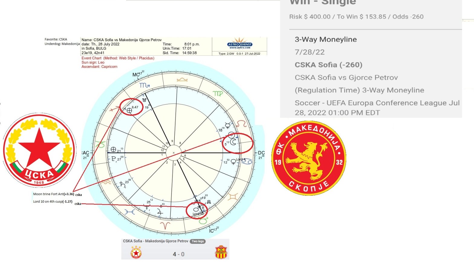 When the favored side has two testimonies(F F) and they are at home then it is always a certain win. The only condition for it to be 100% is that it has to be unique for that day. I have plenty of data to prove that but will not post it here. Bulgaria’s CSKA Sofia were favored against visitors from Macedonia and easily won 4-0. The two aspects favoring cska were the ruler of the 10th house(Favorite) sitting on the 4th(Underdog) and the moon making a trine with the antiscion(shadow) of Fortuna(Favorite).