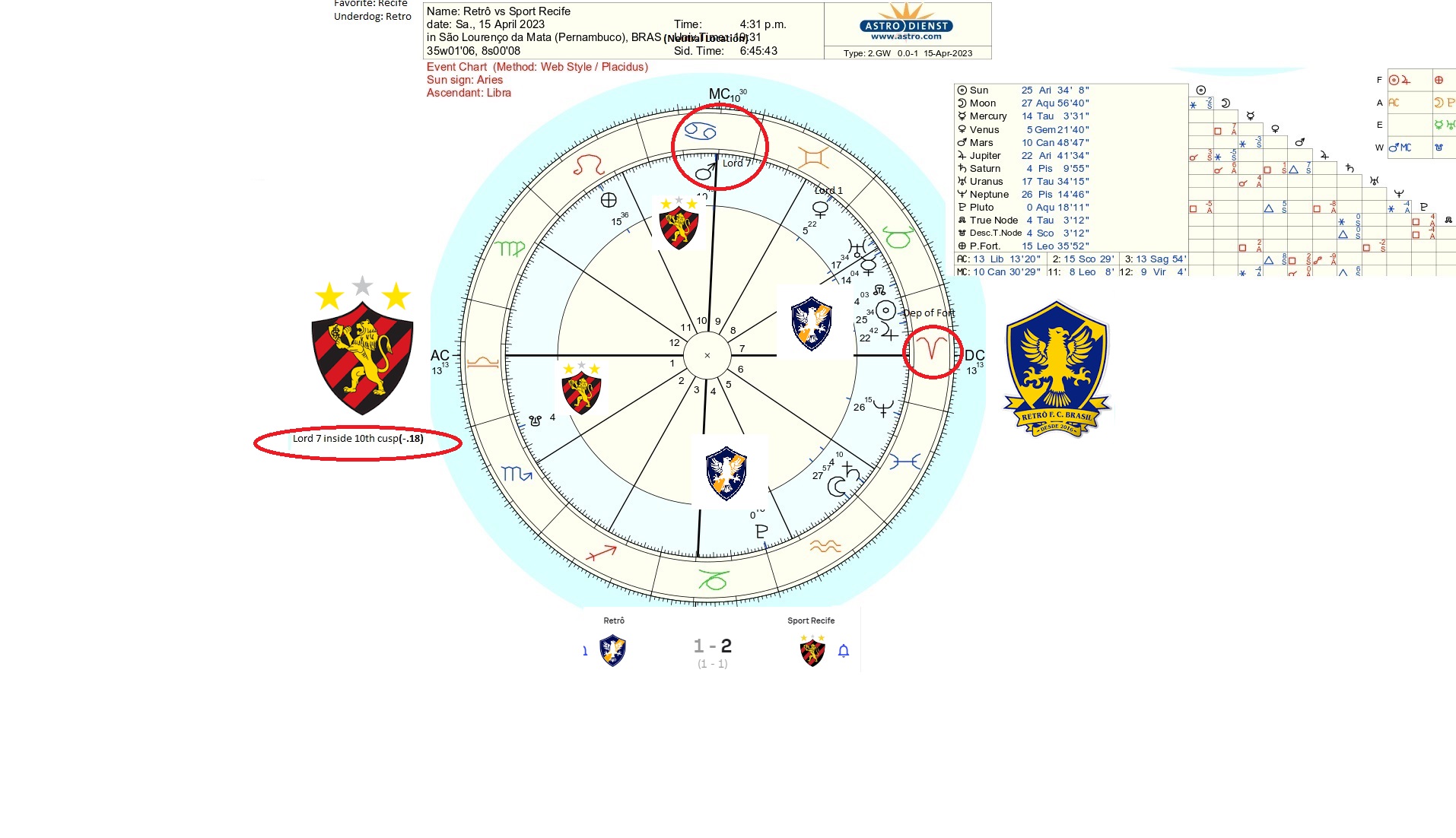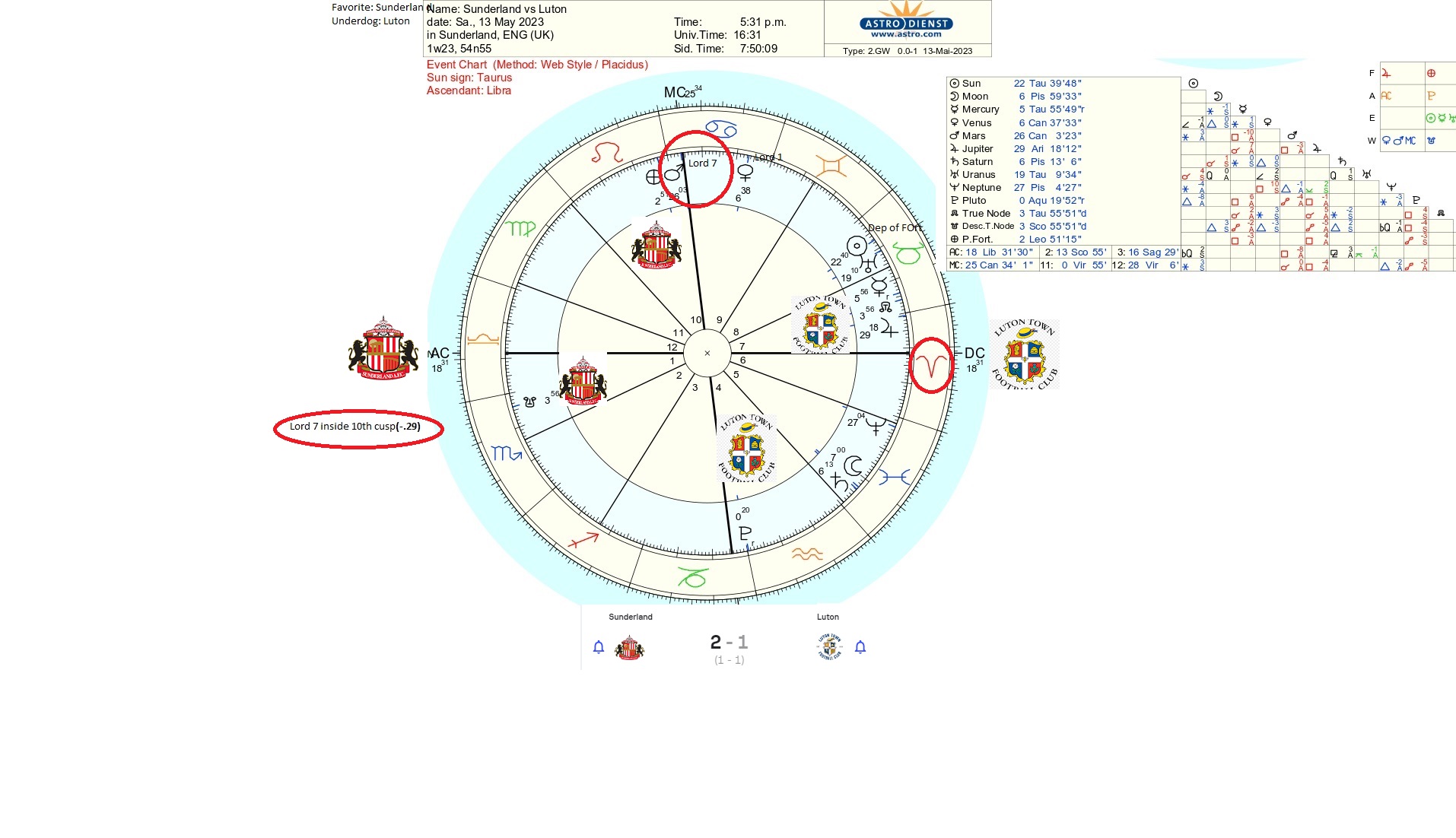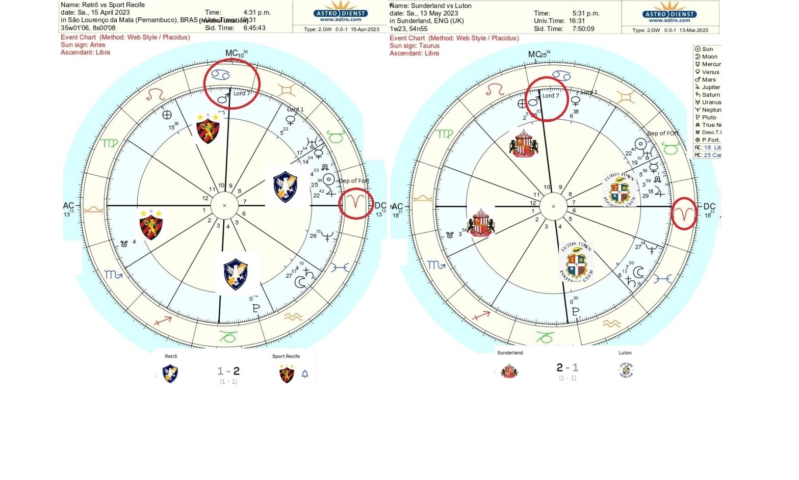 The first match was on April 15th 2023 between two Brazilian local clubs. The underdog was represented by Mars, since the 7th house is Aries, and it was inside the 10th house within 1 degree. The favorites won 2-1! Then pretty much a month later today(May 13th 2023) this same chart showed up in England between favorites Sunderland hosting Luton. Luton scored first but I was not worried since the Luton’s(underdog) planet Mars(Aries ruler) was tucked inside the 10th. Sunderland came back to win 2-1 as well! Both charts had the ruler of the 7th inside the 10th at almost the same degree and the result was the same! Till next time! Stay observing the stars.