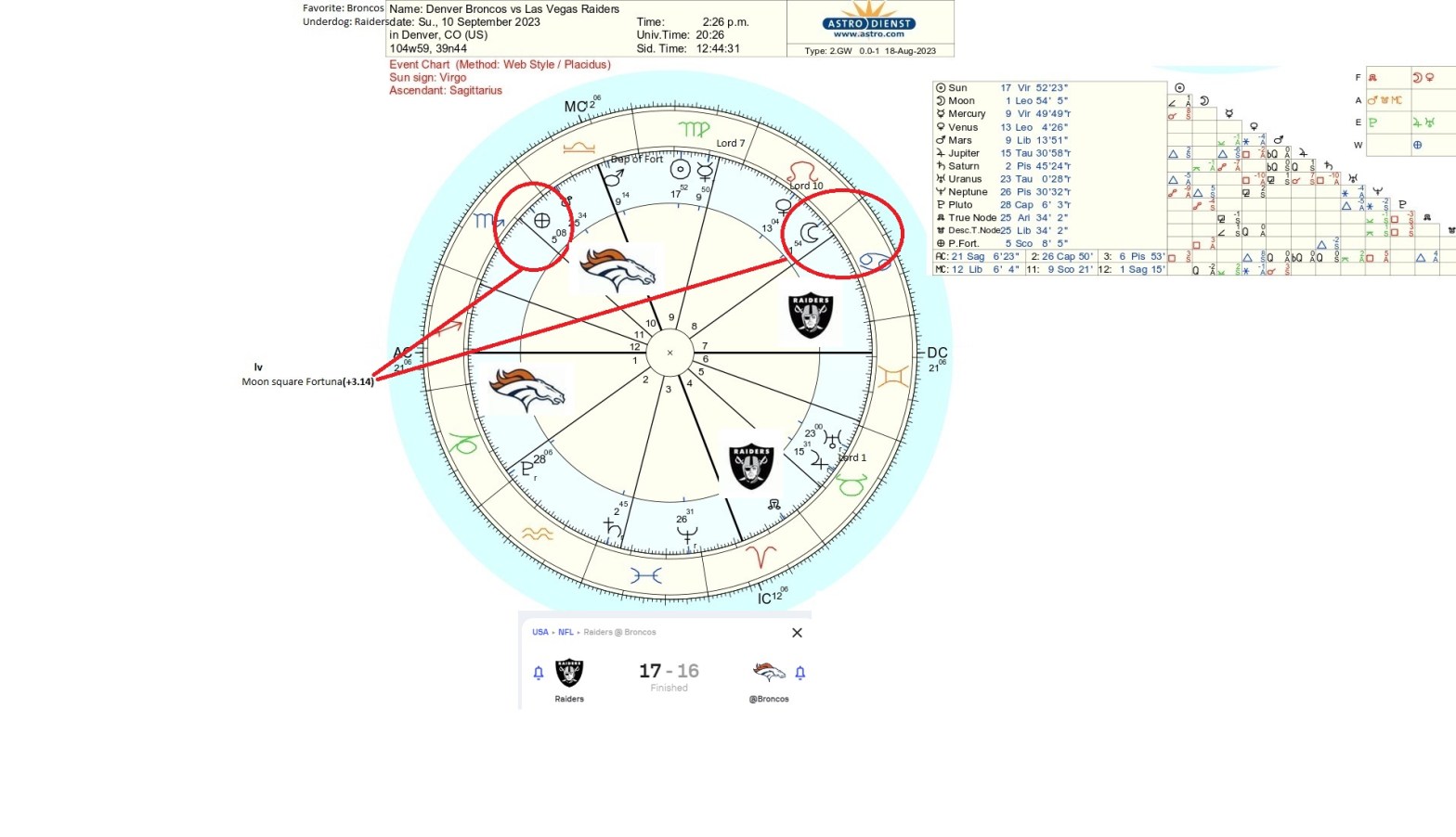 The overhyped Broncos were 3 point favorites only to suffer a loss! At kickoff there was one aspect in the heavens, Moon making a square(90 degrees) to the Pot of Fortune(Fortuna) which spelled trouble for the favored side. The pot of fortune signifies the favored team. This was the only sports event with this aspect at start time for the whole day!