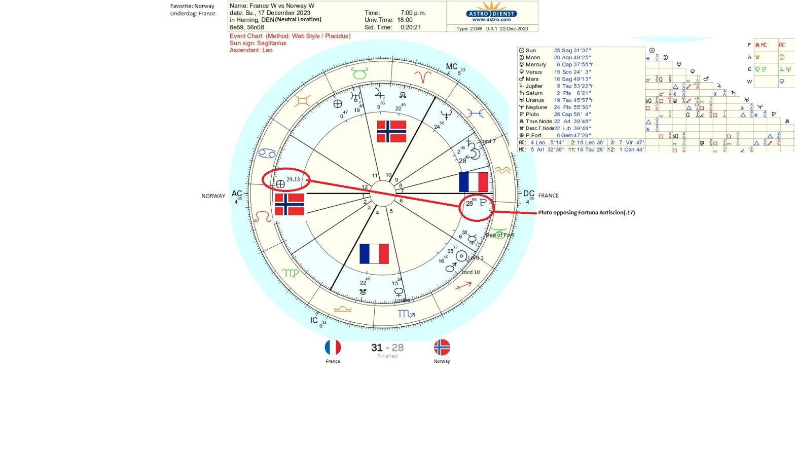 Norway’s womens side faced France in the final of the Handball World cup but were unable to remain champions as France prevailed. At the start of the match, Pluto the destroyer was making a tight opposition to the shadow of Fortuna(favorites), which favored the underdogs! The bookmakers had Norway slightly favored to win over France. ”Pluto does indeed hold a grudge against the favorites. ” – Frawley