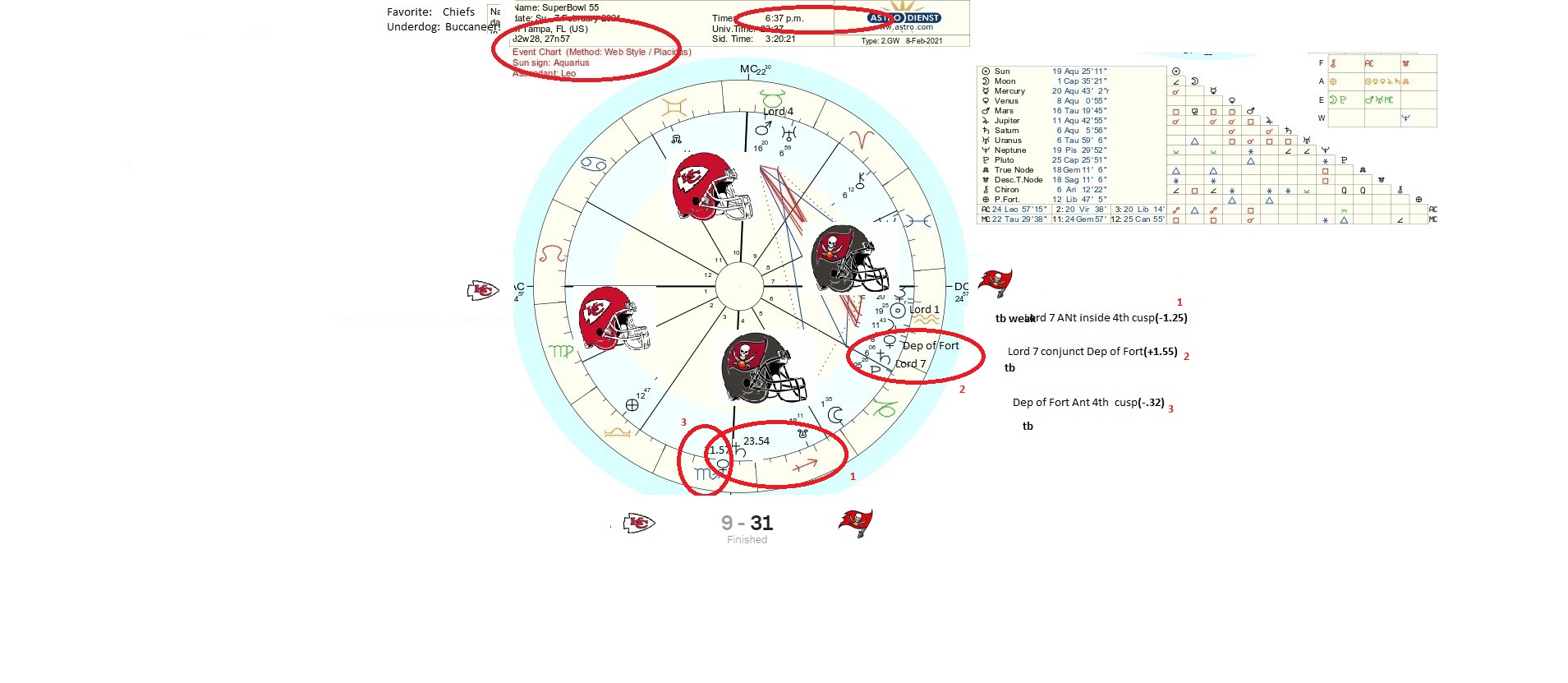 The chart for Superbowl 58 was an easy one! Mainly because it was favoring the underdog, unique, and because it had the same ‘code’ as a previous superbowl, that being 55 played 3 years prior. What was interesting was that both superbowls included the Kansas City Chiefs. In the superbowl 3 years ago the Chiefs were favored to win and lost, while this year they were the underdogs and won. The code for both charts at kickoff was Und Und wUnd, or 2 major aspects and 1 weak aspect to the underdog. When that occurs the favorite does not win due to a certain observed condition 😈. Superbowl 55 was a straight loss for the favorite, while super 58 went into overtime(favorite didn’t win in regulation). All my predictions are for regulation time only.