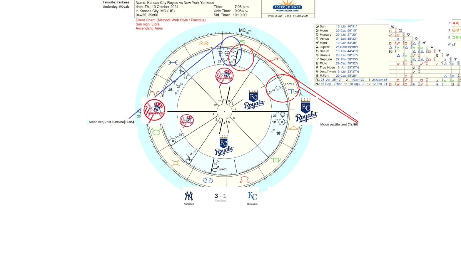 Yankees were favored on the road to beat the Royals and the combinations in the sky at the start of the game agreed! This was as simple of a chart as it gets. Only 2 aspects, both by the moon. First it made a sextile to the ruler of 7th Venus, then went on the conjunct Fortuna which helps the favorites. This was important because the moon’s final aspect determines the winner and it happened to be the Yankees!