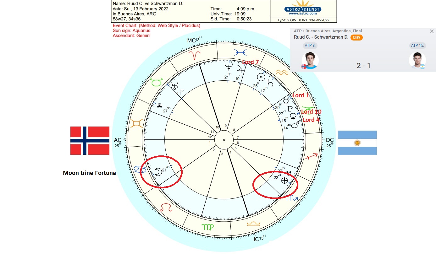 It was the final for the ATP 250 in Buenos Aires. Norway’s Casper Ruud was favored to beat Argentina’s own Diego Schwartzman. Ruud started off a bit shaky and lost the first set but eventually won the next two easily to eventually win the trophy. It seemed as if he was meant to win it.Continue reading “Moon’s trine to Fortuna locks in Ruud’s ATP title”